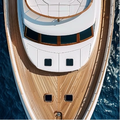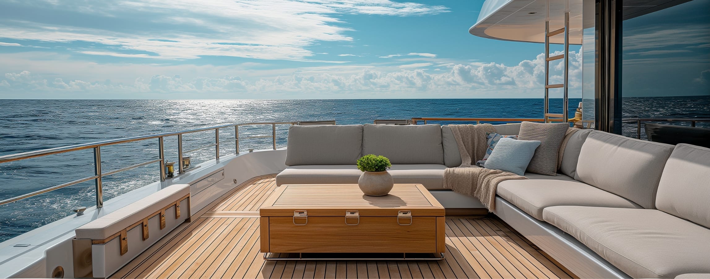 Teak is the most popular wood in the nautical world. This natural wood holds its aesthetic appeal in exterior spaces and is extremely durable, making it an ideal choice for the exterior deck of a yacht.